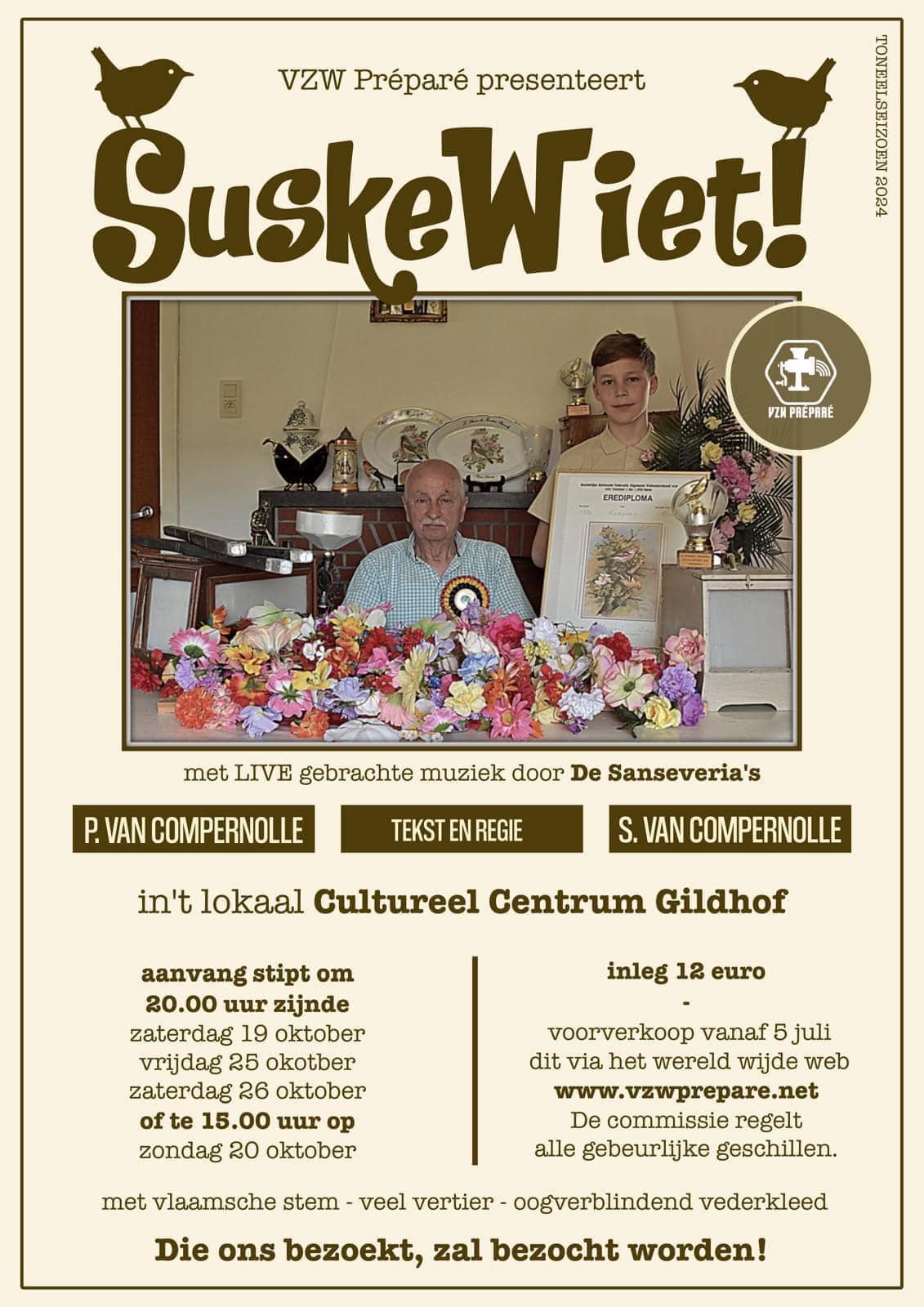 Om de druk van bovenstaande mededelingen te verzachten, neem ik jullie graag mee naar ‘Suskewiet’ een toneelstuk uitgewerkt en gebracht door de Tieltse cultuurvereniging ‘vzw Préparé’. De affiche met uitnodiging maakt onmiddellijk de link naar ons beleven duidelijk.